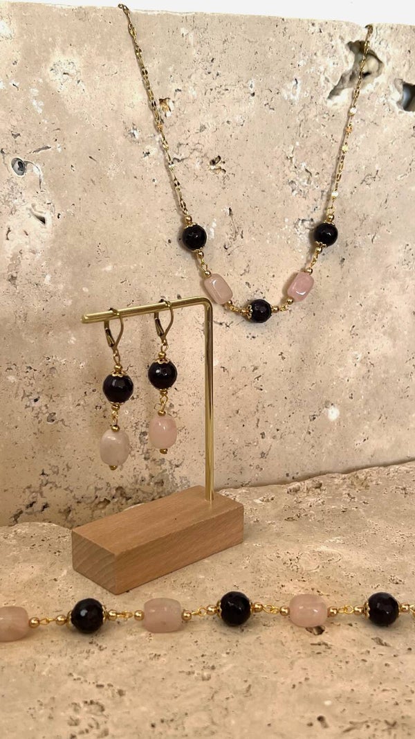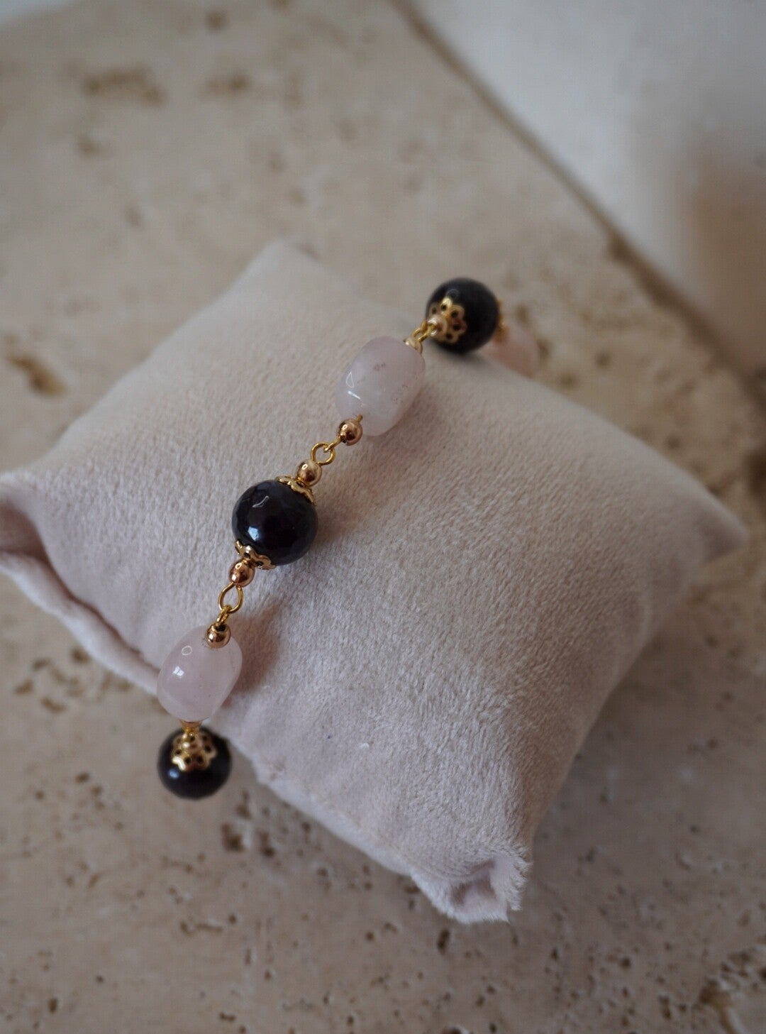 Le bracelet Rose est composé de perles naturelles d’améthyste et de quartz rose.