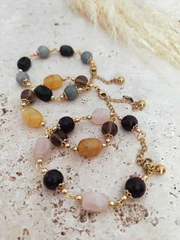 Le bracelet Jaune est composé de perles naturelles de citrine et de quartz fumé