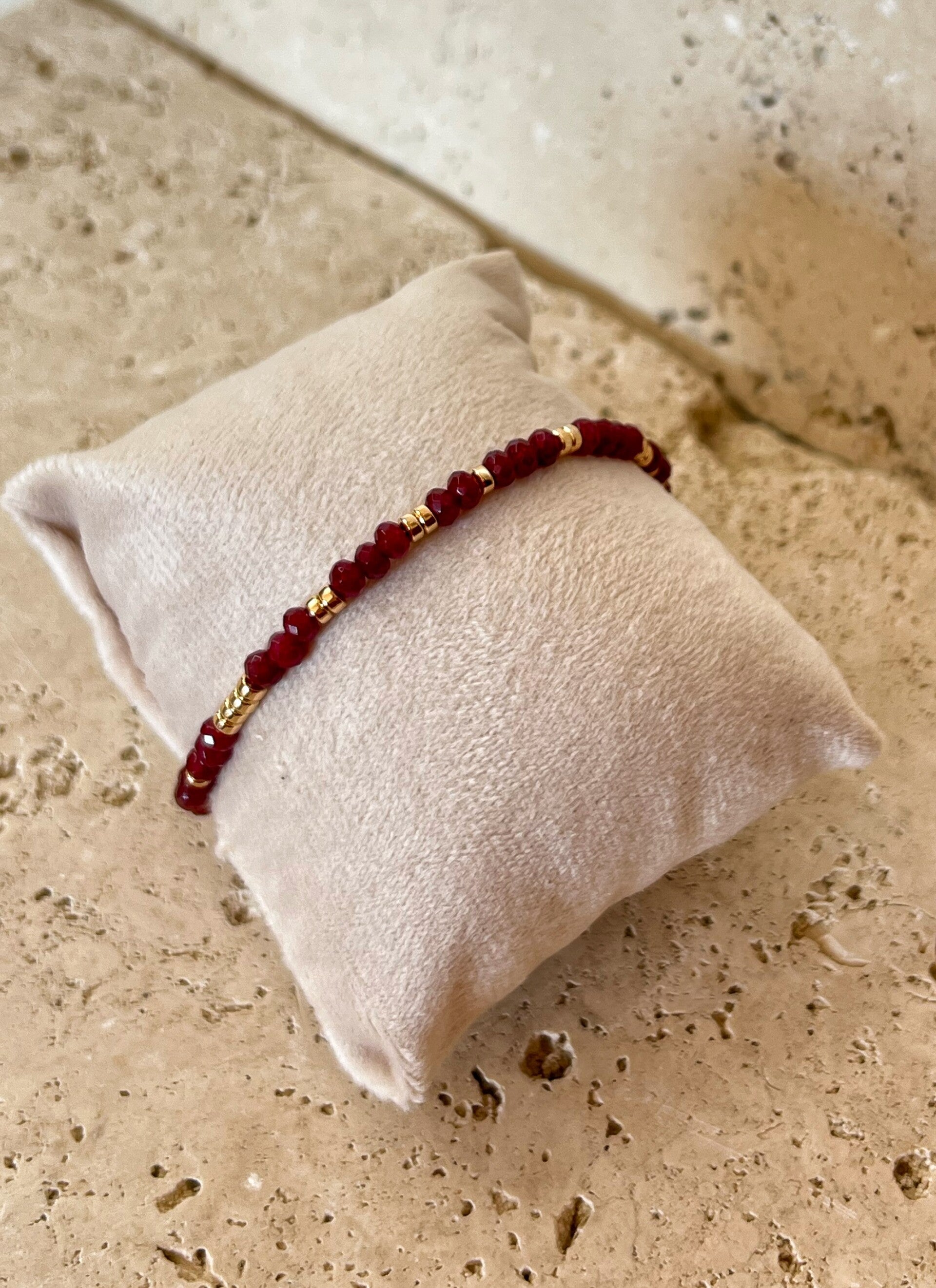 Le bracelet ADONIA rouge se distingue par son élégante enfilade de pierres de calcédoine rouge aux teintes chaleureuses, subtilement contrastées par l’éclat profond de l’hématite. Cette alliance de couleurs crée un bijou à la fois intense et raffiné.