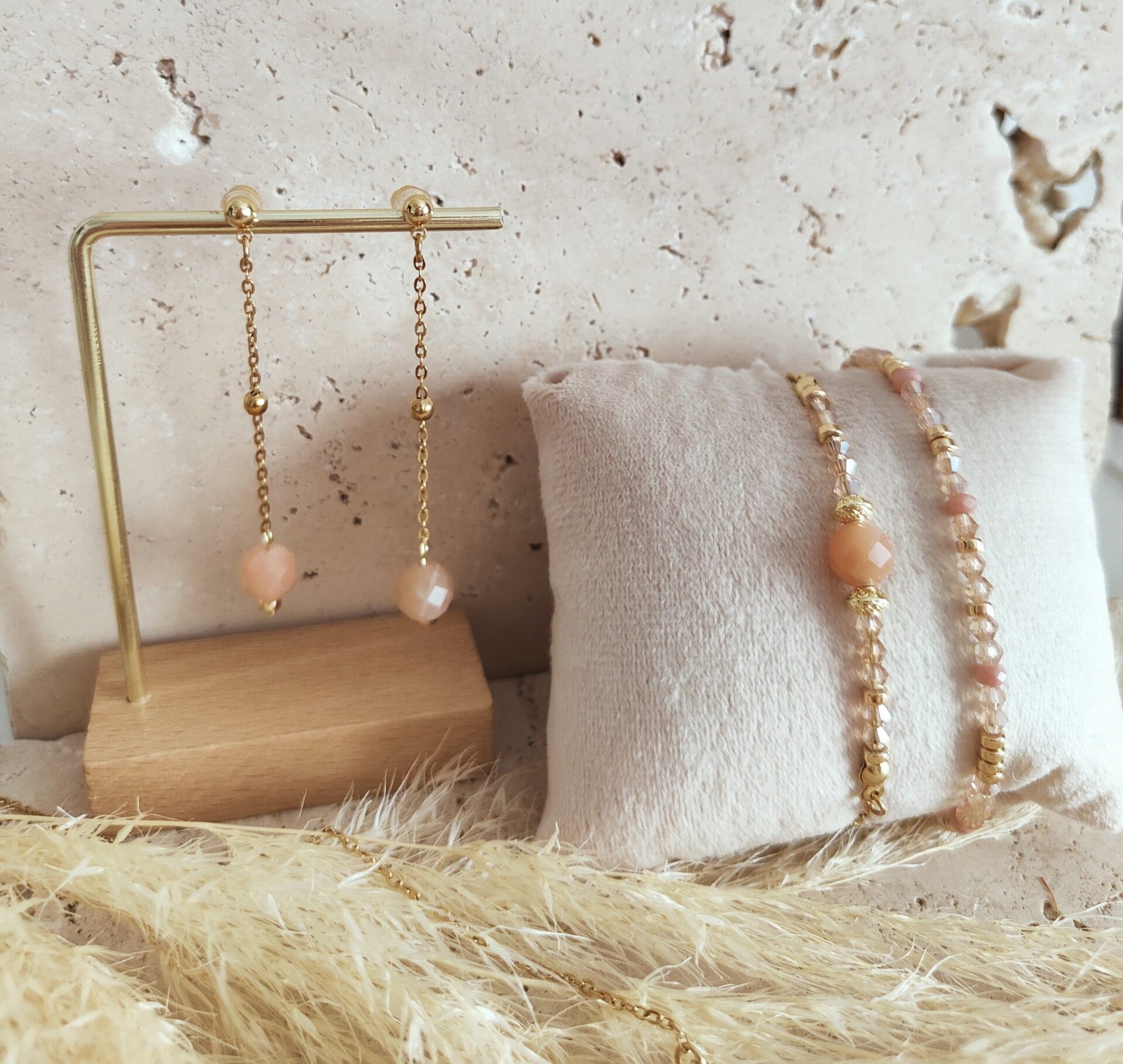 La paire de boucles d’oreilles JAÏS dévoile un design pendante raffiné : une fine chaînette délicatement ponctuée d’une bille en or, se terminant par une pierre de soleil aux reflets chauds et scintillants, illuminés de subtiles paillettes cuivrées.
