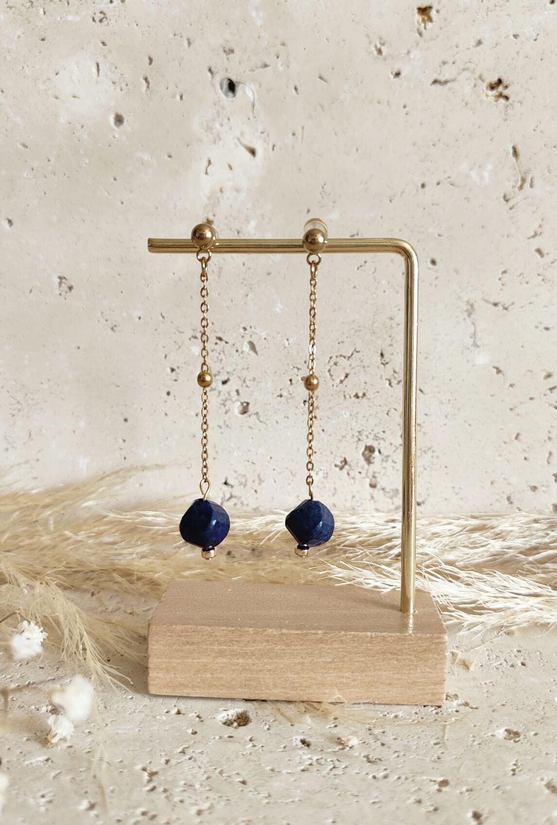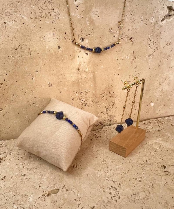 Lapis-lazuli bleu, entouré de petites pierres de lapis-lazuli facettées, pour un bijou profond et élégant aux reflets d’un bleu intense.
