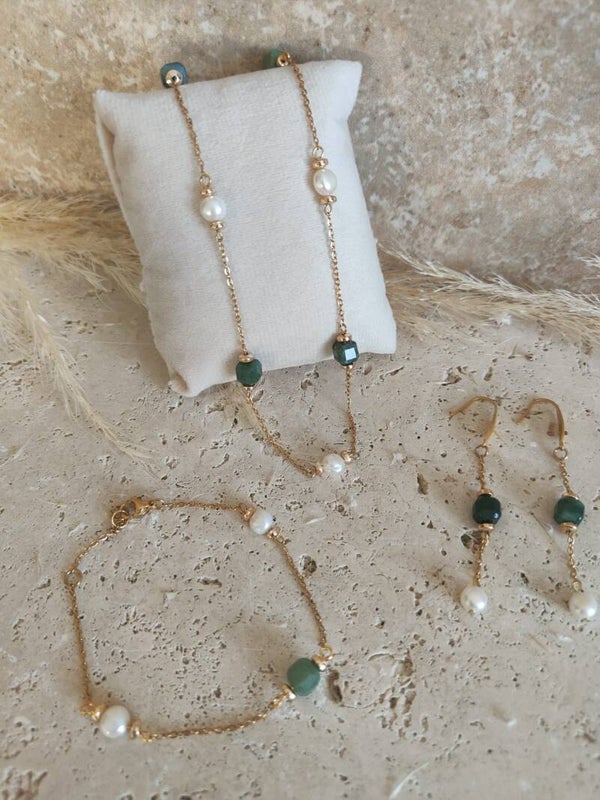 Composé de perles d’eau douce lumineuses, d’une agate indienne aux nuances chaleureuses et de perles d’hématite aux reflets métalliques, il crée un équilibre raffiné entre douceur et contraste. De fins espacements entre les pierres rythment la composition et apportent légèreté et finesse à l’ensemble.