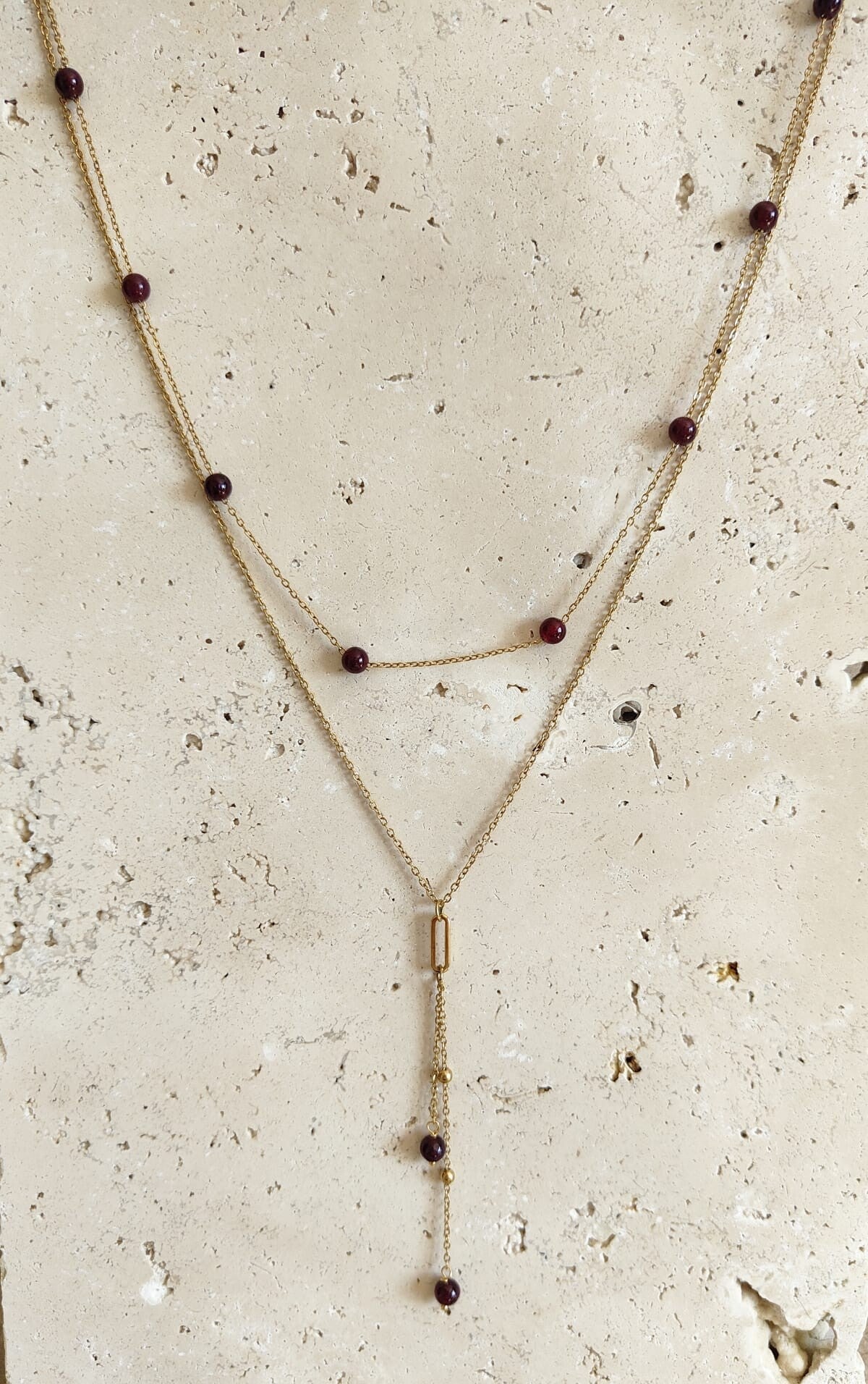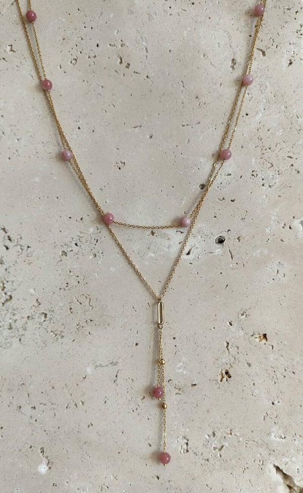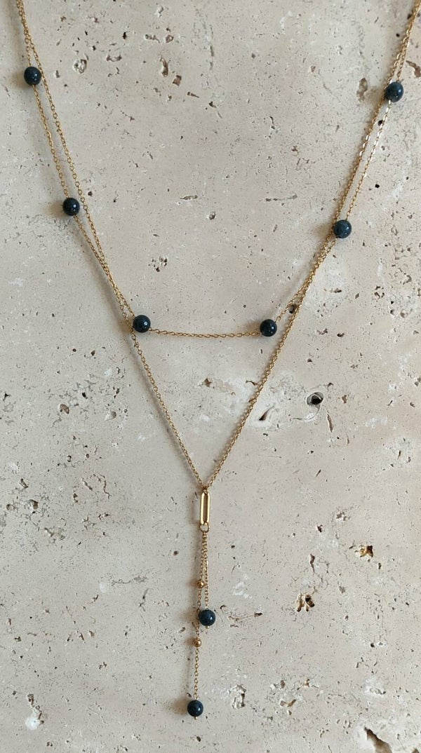 Le collier ESMEE séduit par son design délicat et contemporain en double rang, apportant élégance et légèreté au décolleté. Le premier rang est composé d’une fine chaînette agrémentée de pierres semi-précieuses, qui apportent une touche naturelle et lumineuse. Le second rang est une chaînette en acier inoxydable sublimée par de délicates billes dorées, créant un joli contraste et une touche raffinée.