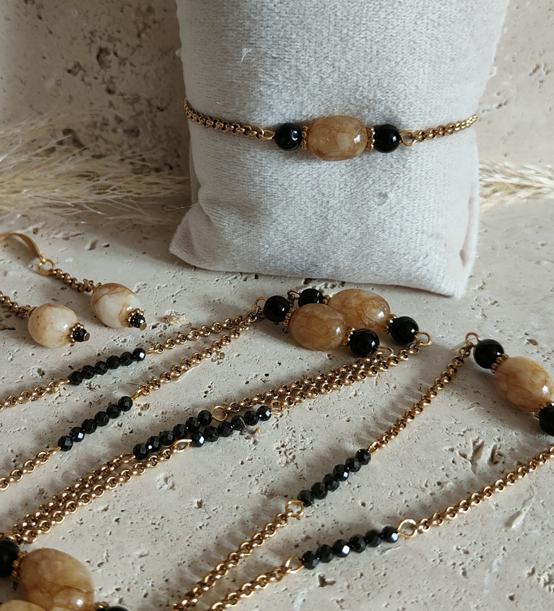 Au centre du bracelet, une pierre d’agate jaune illumine la composition par sa teinte solaire et chaleureuse. Elle est délicatement entourée de pierres d’onyx noir, créant un contraste profond et raffiné. L’ensemble est sublimé par une douce collerette dentellée qui apporte une touche de délicatesse et de relief au bijou.