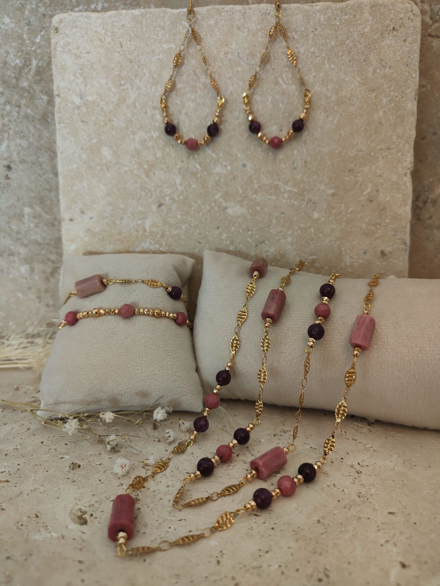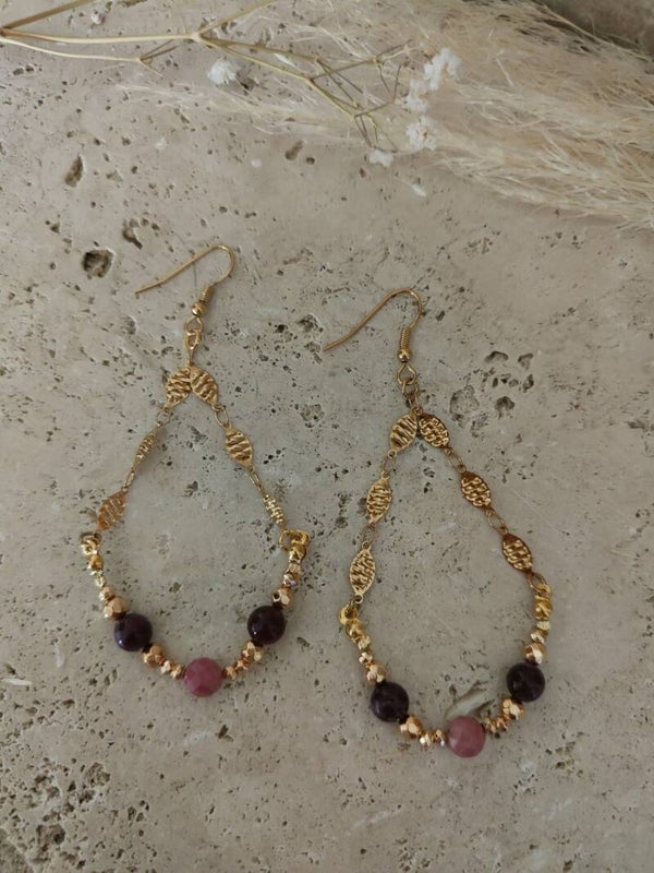 Au cœur de chaque boucle, une perle en pierre de rhodonite dévoile ses nuances rosées douces et élégantes. Elle est subtilement entourée de pierres d’améthyste et d’hématite, créant un joli contraste entre la tendresse du rose, la profondeur du violet et l’éclat métallique sombre.