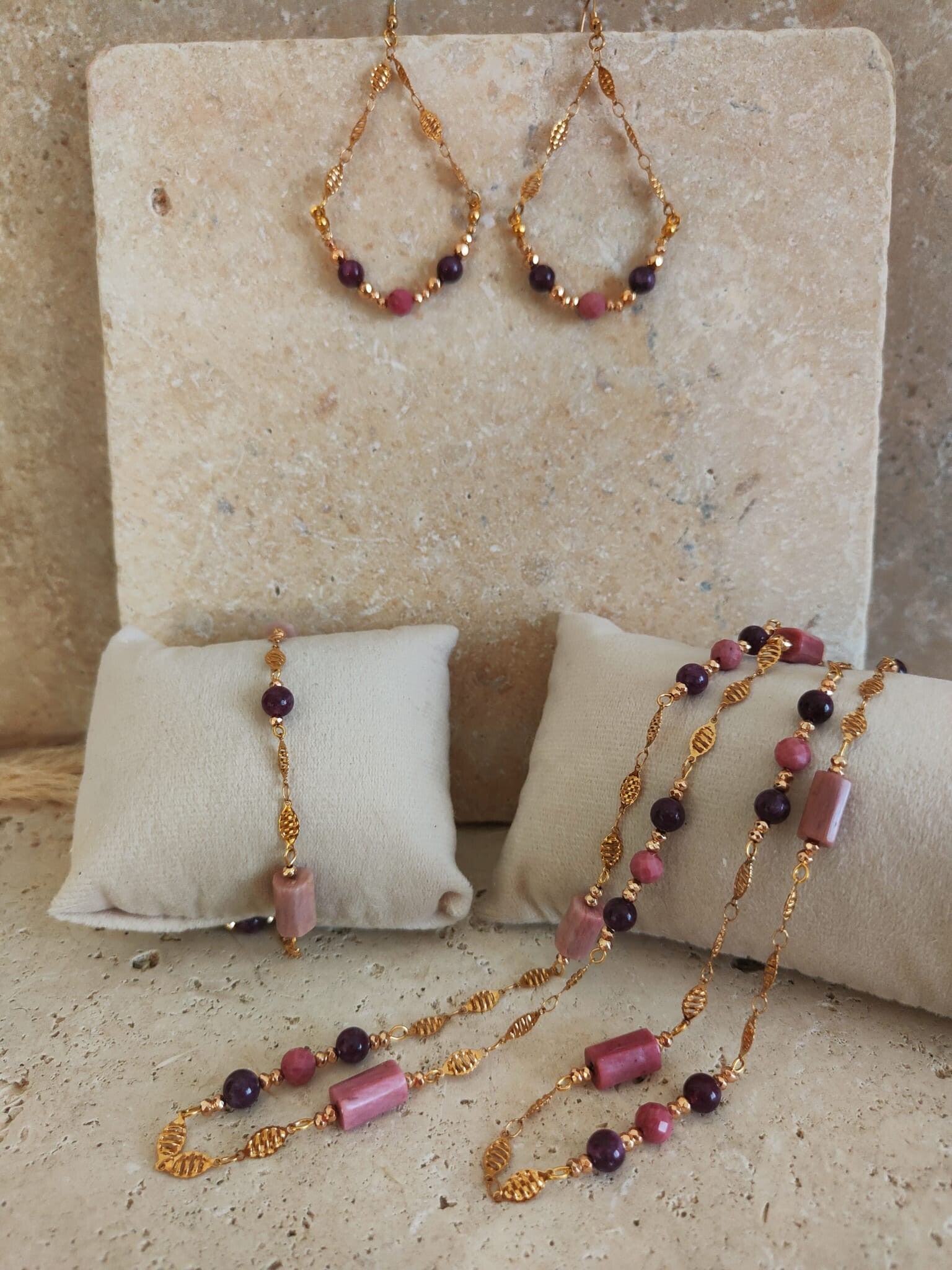 Les boucles d’oreilles LINA, quant à elles, dévoilent une composition originale en forme de petit panier : une perle de rhodonite entourée d’améthyste et d’hématite, délicatement suspendue à deux chaînettes dentelle en acier inoxydable, apportant légèreté et mouvement.