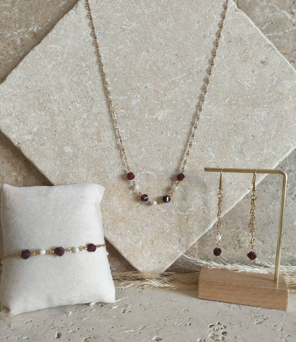 Le collier TOPAZE rouge séduit par son design élégant et raffiné : monté sur une fine chaîne en acier inoxydable, il est sublimé par quatre pierres de grenat aux reflets rouge profond, accompagnées de trois perles d’eau douce lumineuses qui apportent douceur et contraste.