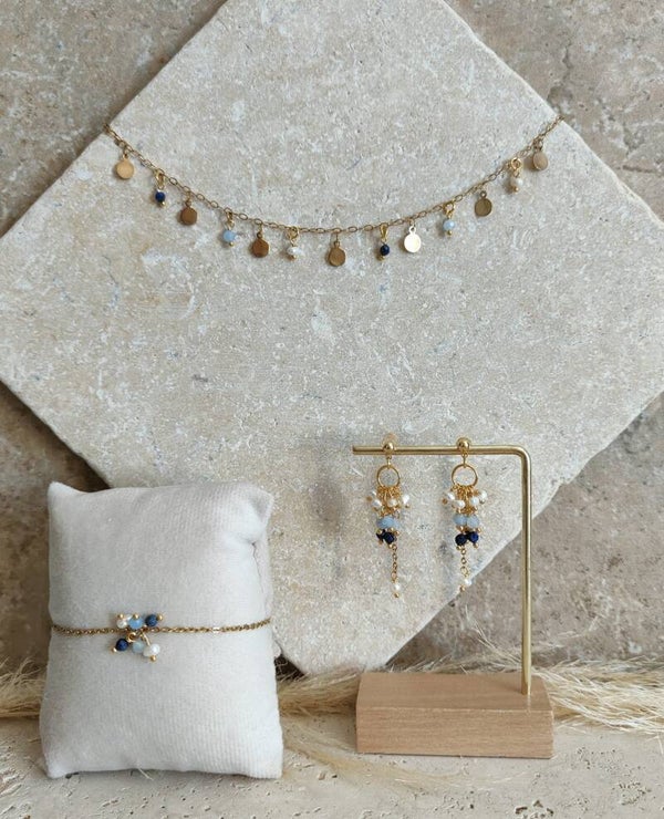 De fines pierres et perles s’y alternent avec harmonie : la douceur nacrée de la perle d’eau douce, la fraîcheur cristalline de l’aigue-marine et la profondeur intense du lapis-lazuli. Cette composition crée un jeu de couleurs à la fois apaisant et lumineux, évoquant les nuances naturelles de l’eau et du ciel.