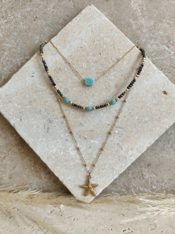 En son centre, un charme en forme d’étoile de mer vient sublimer l’ensemble, apportant une note marine et poétique. Symbole de liberté et de voyage, il confère au collier un esprit estival tout en restant raffiné.