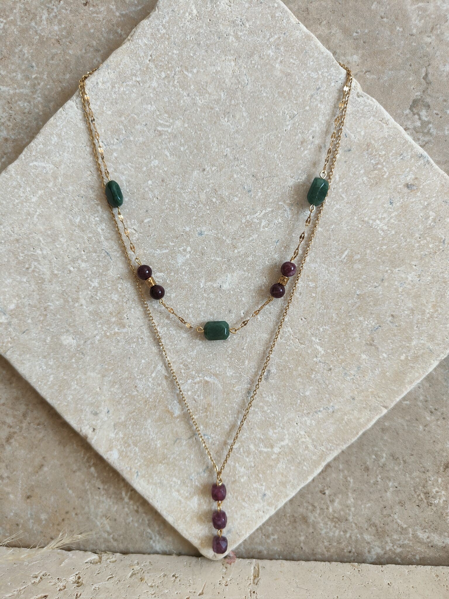 Son design alterne avec subtilité des pierres rectangulaires de jaspe vert et des perles rondes de calcédoine rouge, créant un rythme visuel équilibré et captivant.