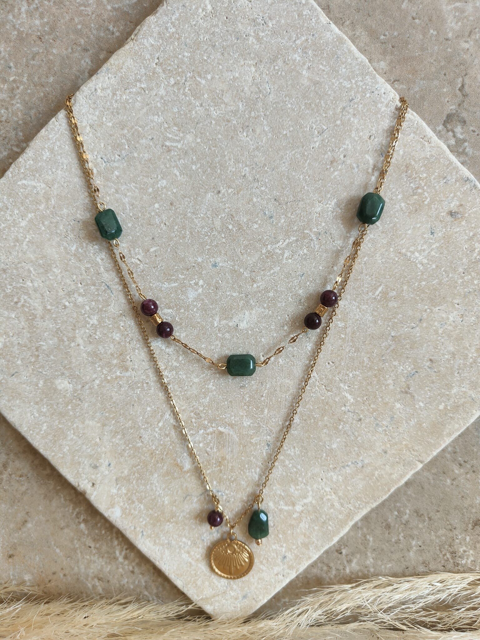Le collier ALICE séduit par son équilibre subtil entre couleur et lumière. Monté sur une fine chaîne en acier inoxydable, il est orné en son centre de trois pendentifs soigneusement choisis : une pierre de calcédoine rouge aux reflets chauds, une pierre de jaspe verte taillée en rectangle et un charm solaire qui apporte éclat et poésie.