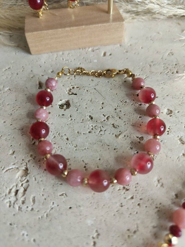 Le bracelet SERENA incarne une élégance lumineuse et pleine de douceur. Il se compose d’une alternance harmonieuse de perles de jade rubis, aux teintes profondes et chaleureuses, de pierre de soleil aux reflets délicatement scintillants, et d’hématite dorée qui apporte une touche précieuse et contemporaine.