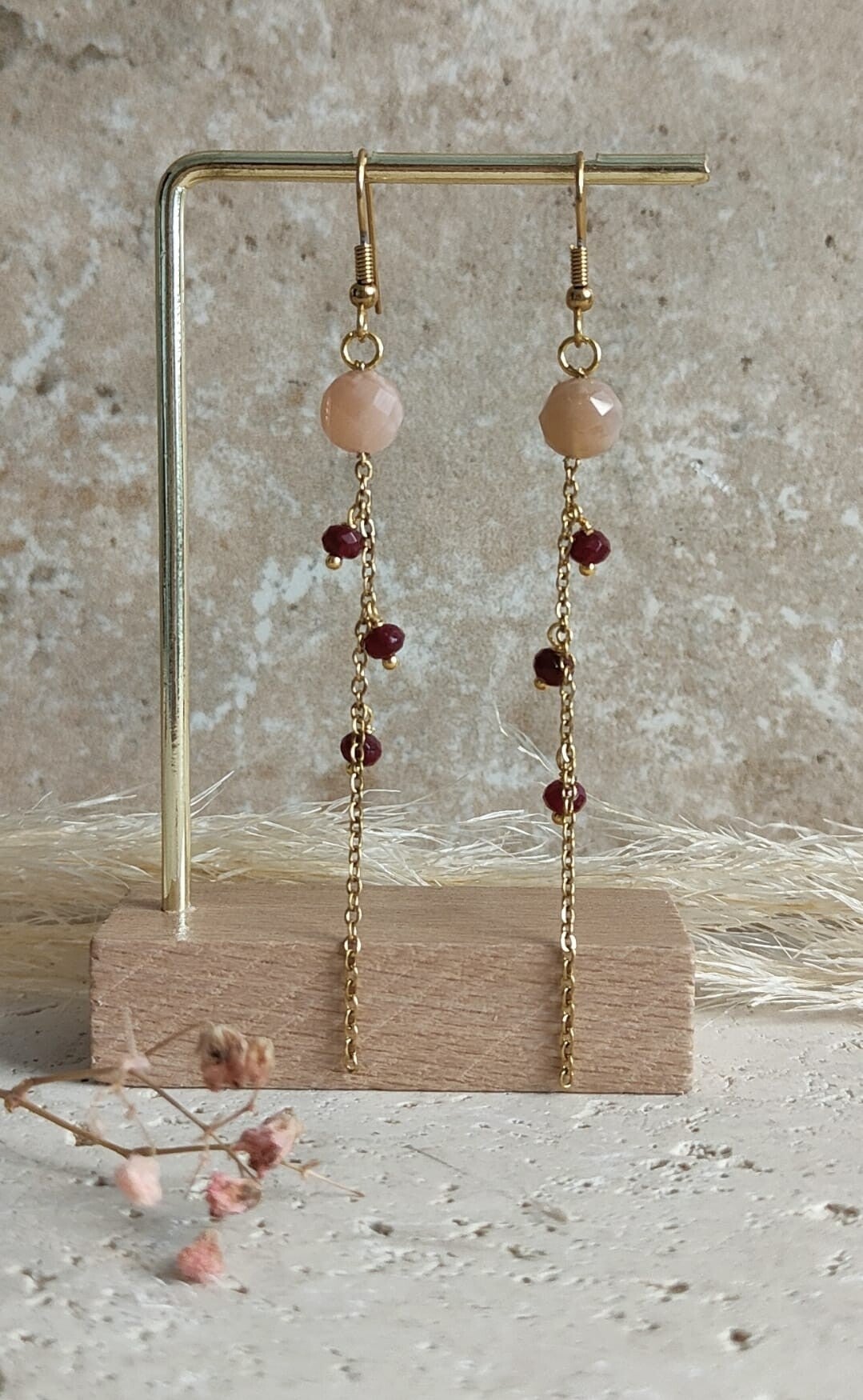 Le collier SERENA se distingue par son design raffiné et rythmé, pensé comme une alternance élégante de deux sections complémentaires. Il associe la profondeur du jade rubis à une composition lumineuse mêlant pierre de soleil, grenat et hématite dorée, créant un jeu de contrastes subtil entre chaleur, éclat et intensité.