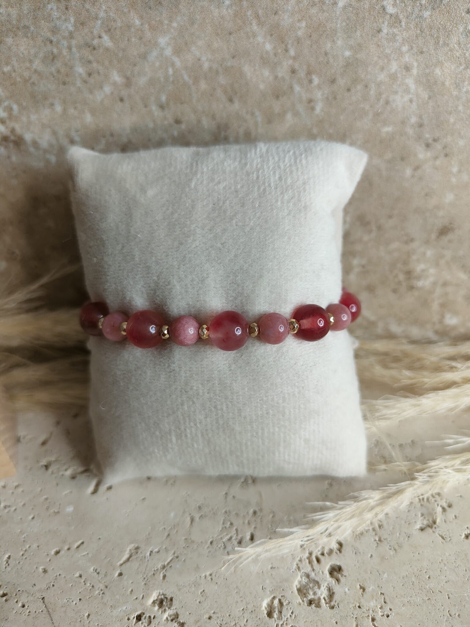 Chaque perle de jade rubis apporte une touche de caractère et de profondeur, tandis que la seconde section révèle un assemblage harmonieux de pierres aux reflets variés : la pierre de soleil illumine l’ensemble, le grenat renforce son intensité, et l’hématite dorée apporte une finition précieuse et contemporaine.