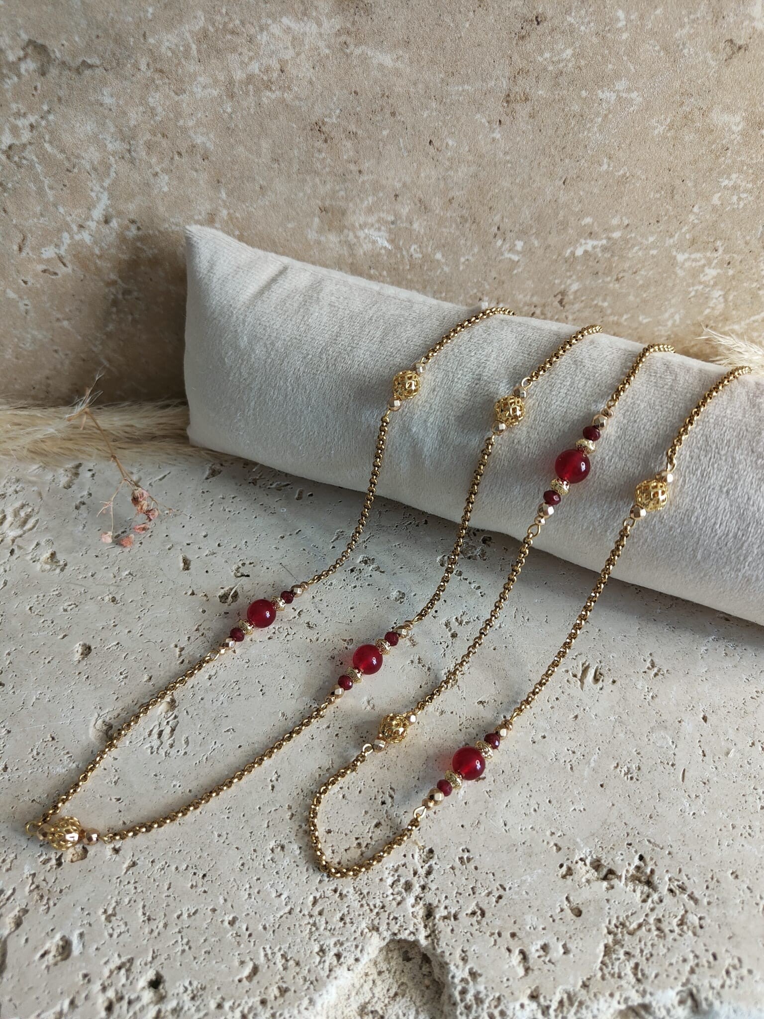 Son design repose sur une alternance harmonieuse d’éléments soigneusement travaillés : une boule ciselée dorée au relief subtil, une fine chaînette en acier inoxydable doré pour plus de légèreté, puis une composition raffinée mêlant une perle de jade rubis entourée de perles dorées et de grenat. Cette succession crée un rythme élégant, entre textures et éclats.