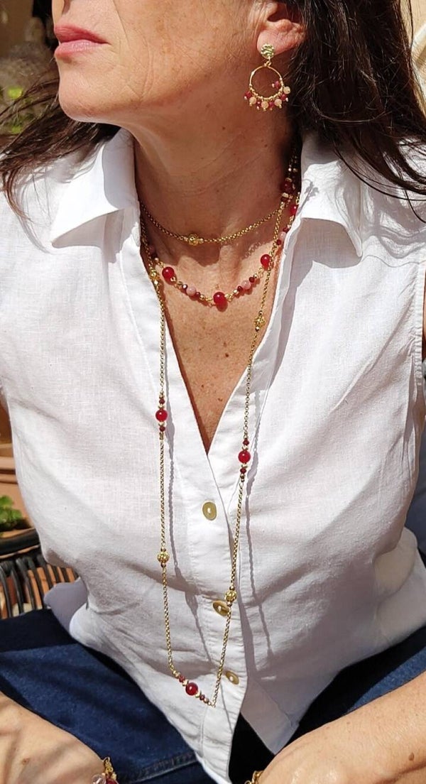 Le contraste entre la profondeur du jade rubis, l’intensité du grenat et la brillance des éléments dorés offre un rendu à la fois chaleureux et précieux. Le sautoir RUBIS est une pièce de caractère, idéale pour sublimer une tenue avec raffinement, tout en jouant sur les superpositions et les volumes.
