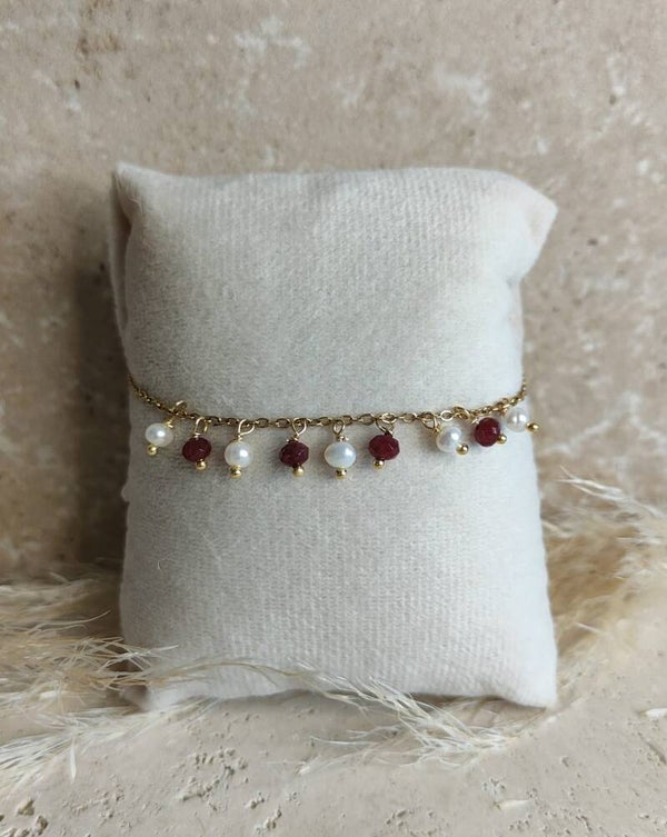 Chaque pièce joue avec la lumière et le mouvement pour révéler un contraste subtil entre la douceur des perles et l’intensité du grenat. Ensemble, elles créent une allure raffinée et féminine, parfaite pour sublimer aussi bien une tenue du quotidien qu’un look plus habillé.
