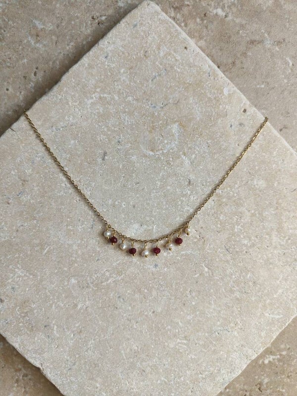 La parure ANAÏS incarne une élégance délicate et une harmonie naturelle. Composée du ras de cou, du bracelet et des boucles d’oreilles assorties, elle met à l’honneur une succession de pampilles mêlant perles d’eau douce aux reflets nacrés et pierres de grenat aux teintes rouge profond, montées sur de fines chaînettes en acier inoxydable.