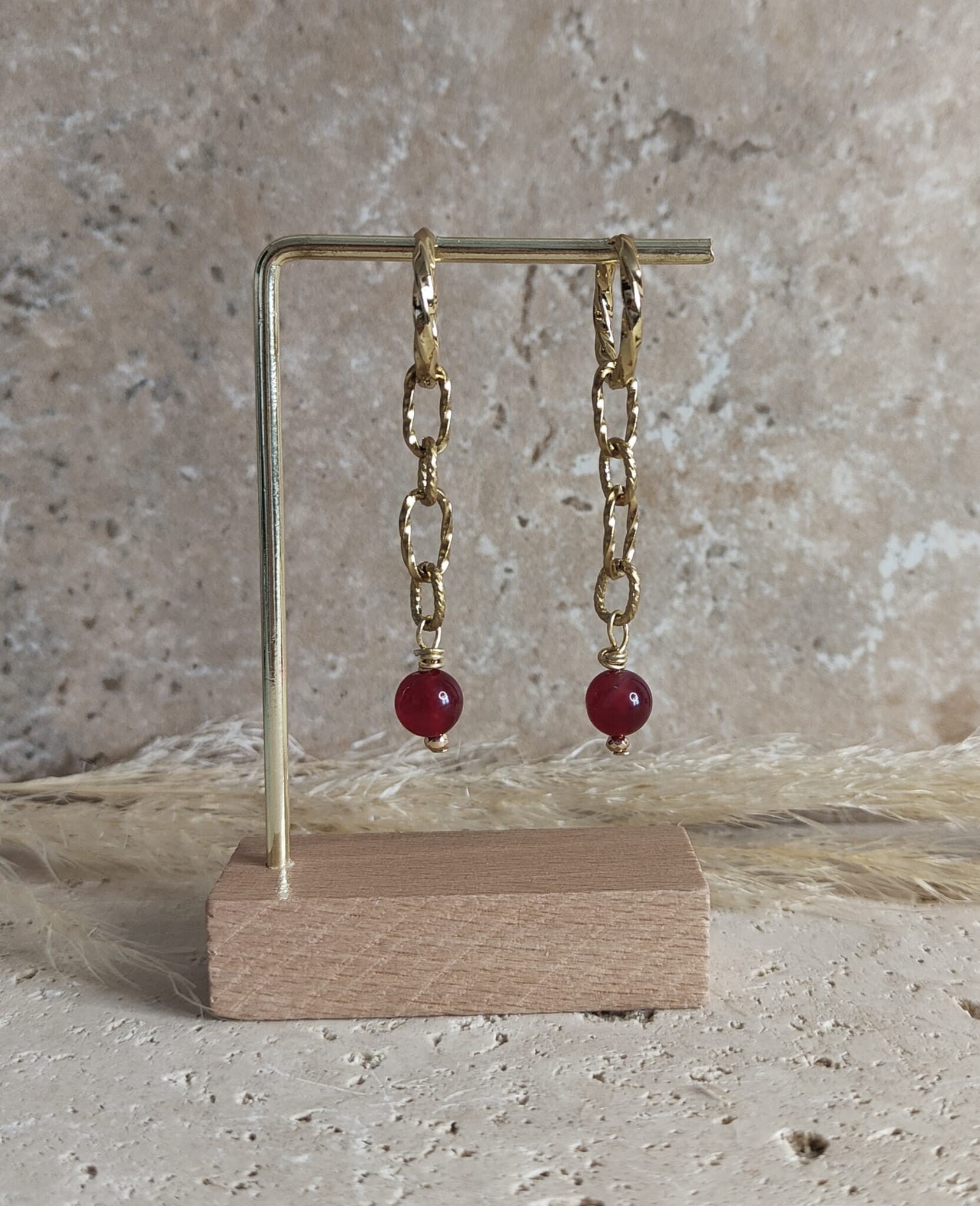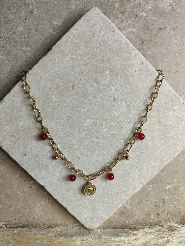 Le collier met en valeur un charme solaire central, tandis que le bracelet joue sur une alternance de perles suspendues sur une chaîne à gros maillons. Les boucles d’oreilles, quant à elles, apportent du mouvement avec leur perle de jade rouge suspendue à une chaîne et un anneau torsadé.