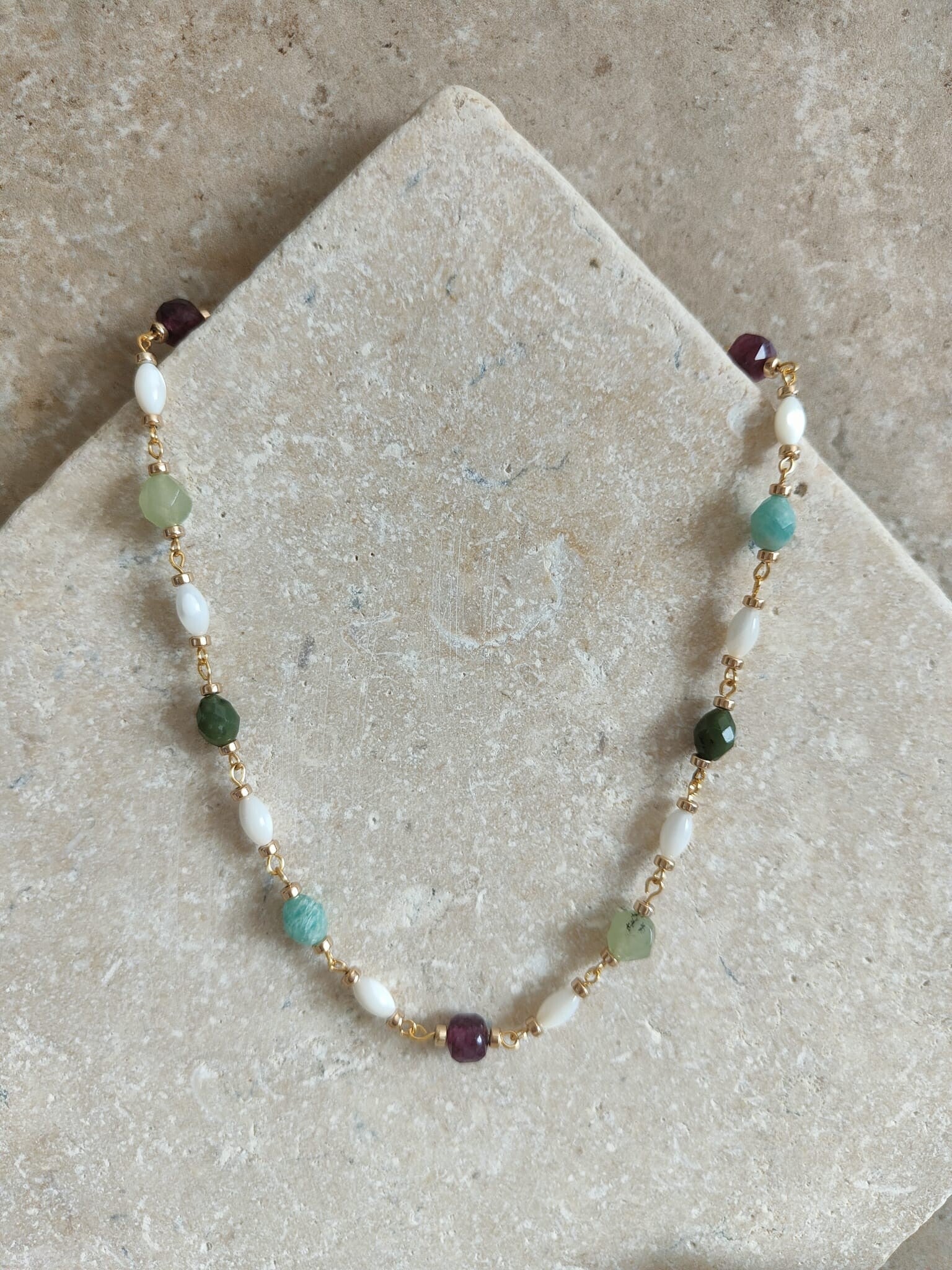 Il se compose d’une alternance harmonieuse de perles de nacre, aux reflets doux et lumineux, et de pierres naturelles aux teintes variées : l’amazonite bleu apaisante, le jaspe vert aux nuances profondes, le jaspe lie de vin riche et chaleureux, ainsi que l’aventurine aux éclats délicatement scintillants.