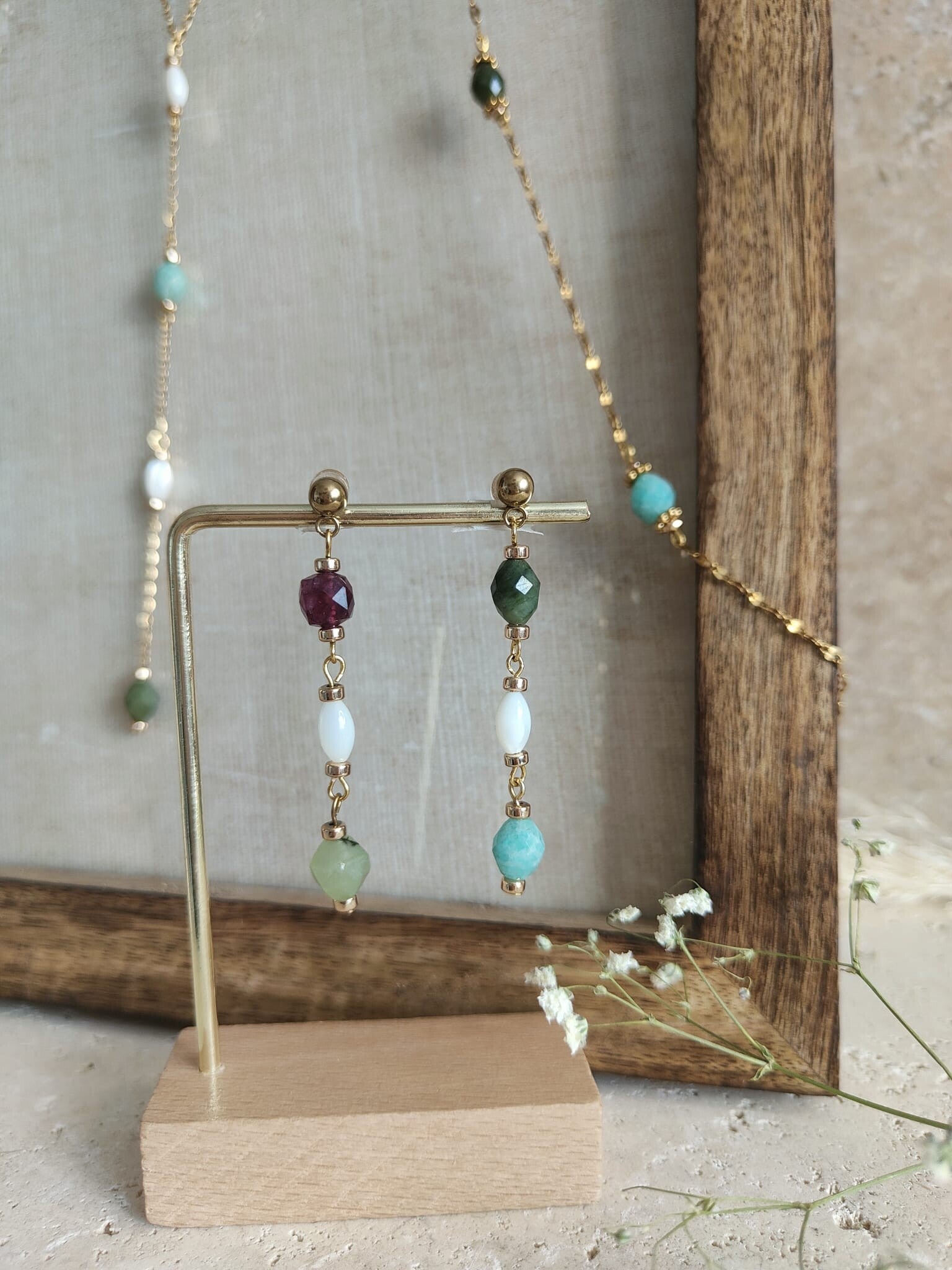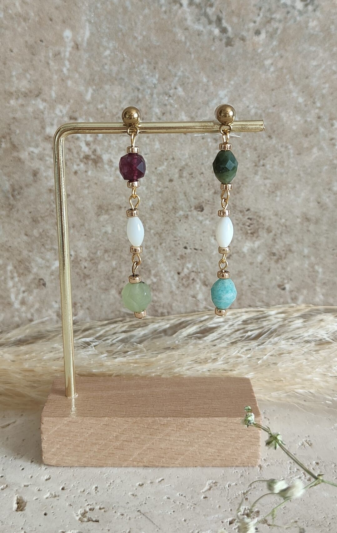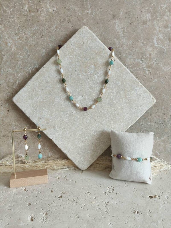 On y retrouve l’amazonite bleu aux reflets apaisants, le jaspe vert profond, le jaspe lie de vin aux tonalités chaleureuses, ainsi que l’aventurine délicatement scintillante. Cet assemblage est sublimé par des perles de nacre, qui ajoutent une note douce et lumineuse à l’ensemble.