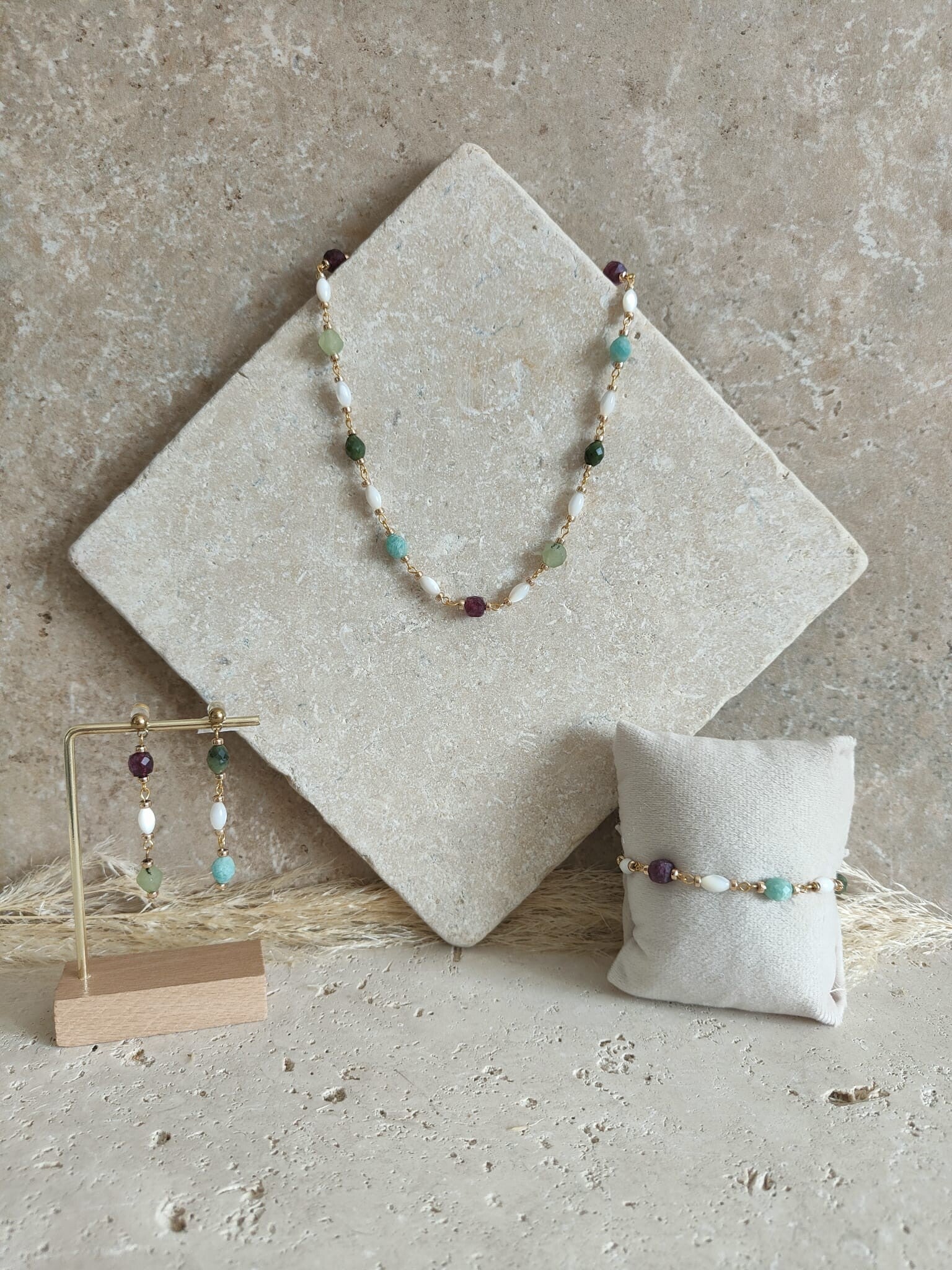 Le collier ras de cou épouse délicatement la ligne du cou avec une alternance de perles de nacre lumineuses et de pierres naturelles aux nuances variées : amazonite bleu, jaspe vert, jaspe lie de vin et aventurine. Le bracelet multicolore reprend ce même jeu de matières et de couleurs, apportant une touche vibrante et équilibrée au poignet. Les boucles d’oreilles, quant à elles, complètent parfaitement l’ensemble avec leur mélange de pierres et leur fermoir boule, alliant confort et élégance.