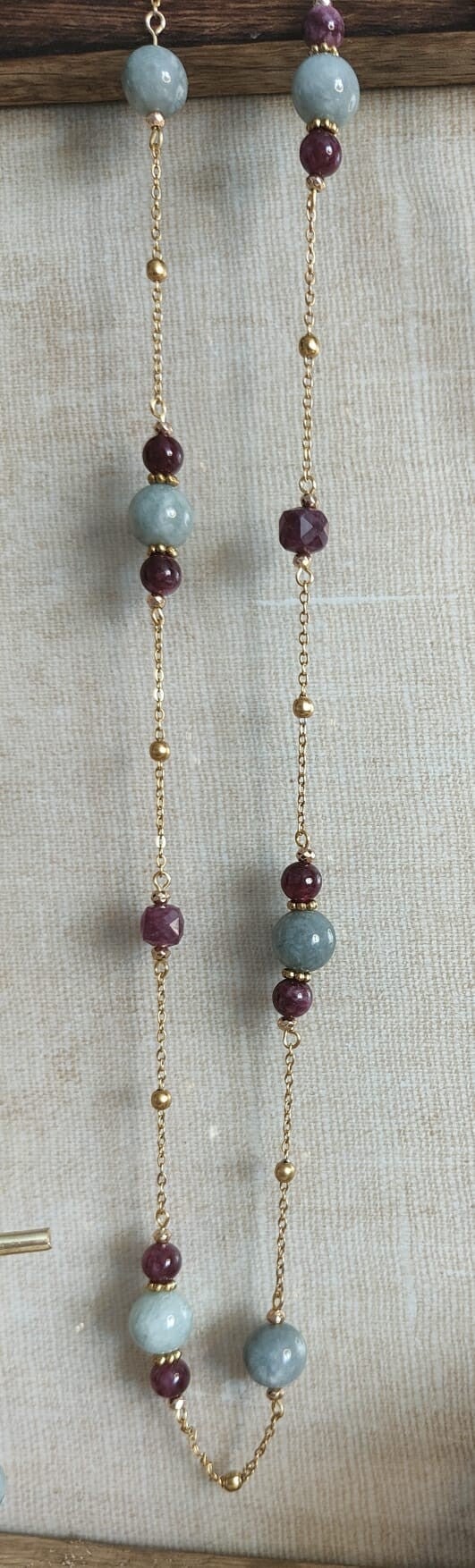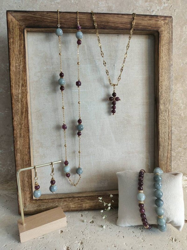 Son design repose sur une alternance subtile : une section de chaînette boule apporte de la légèreté et du mouvement, laissant place à une pierre de Birmanie mise en valeur par un entourage de calcédoine rouge. Cette séquence se prolonge par une nouvelle portion de chaînette, puis par une autre pierre de Birmanie associée, selon les variations, à de l’hématite ou à du jaspe lie de vin.